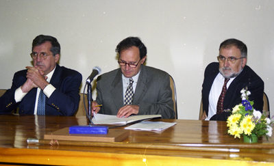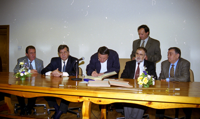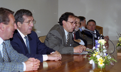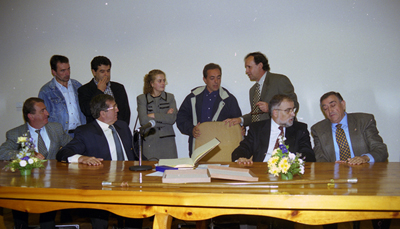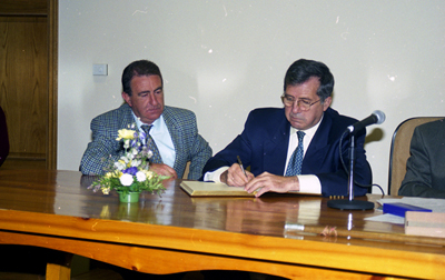 | Descripción: En primer plano a la izquierda, Nicolás Noguero de Antonio, miembro de la corporación municipal; al otro lado de la mesa, el segundo por la izquierda, con gafas, el gobernador, Gil Sastre.... |