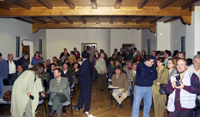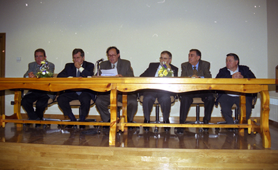 | Descripción: Sentados, los representantes oficiales, entre los que se identifica a José Méliz, miembro de la corporación municipal. Entre el público, Encarnita y Pili Solans, Pedro de Mur, A. Noguero, Roquito y José Luis Méliz.... |