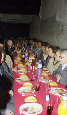 | Descripción: En la mesa presidencial, de izquierda a derecha, Agustín Salcedo, el obispo, el representante del Gobierno Civil y un sacerdote. En el otro tramo de la mesa se ja identificado a J. A. Lalueza y a un tal Victoria, en representación de Iberduero.... |