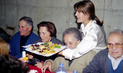| Descripción: La mujer que sirve la mesa es Ana Méliz; los niños, María Ángeles Escalona, de casa Sastremajo, y J. Mur, de casa Monclús. Los comensales son Cantero Cuadrado y un representante del Gobierno Civil, en el centro, y a los lados Roque (el alcalde) y J. A. Lalueza (cura párroco) .... |