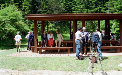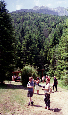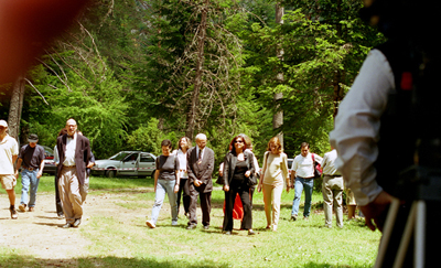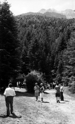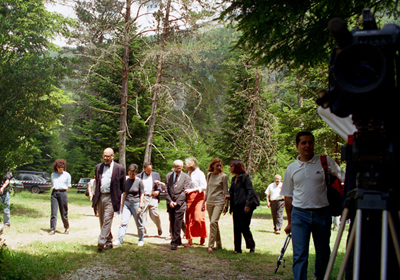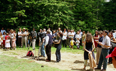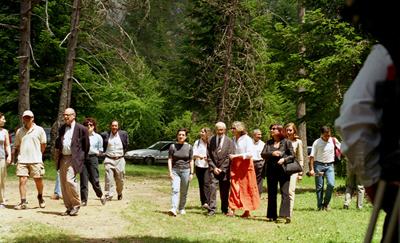 Descripción: La corporación municipal ha recibido al obispo y asus acampañantes y se dirigen a la plaza donde el pueblo de Bielsa espera para darles la bienvenida.