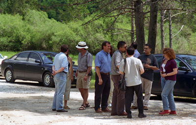 | Descripción: En el centro aparece el gobernador Gil Sastre, con gafas oscuras y bastón, junto al alcalde de Bielsa, Antonio Mazcaray. Otras personas que se ven en primer plano son J. Méliz, J. Vidallé (Pepé Secretario), Cesar Pintado, Ramón, Baticer y Siso.... |